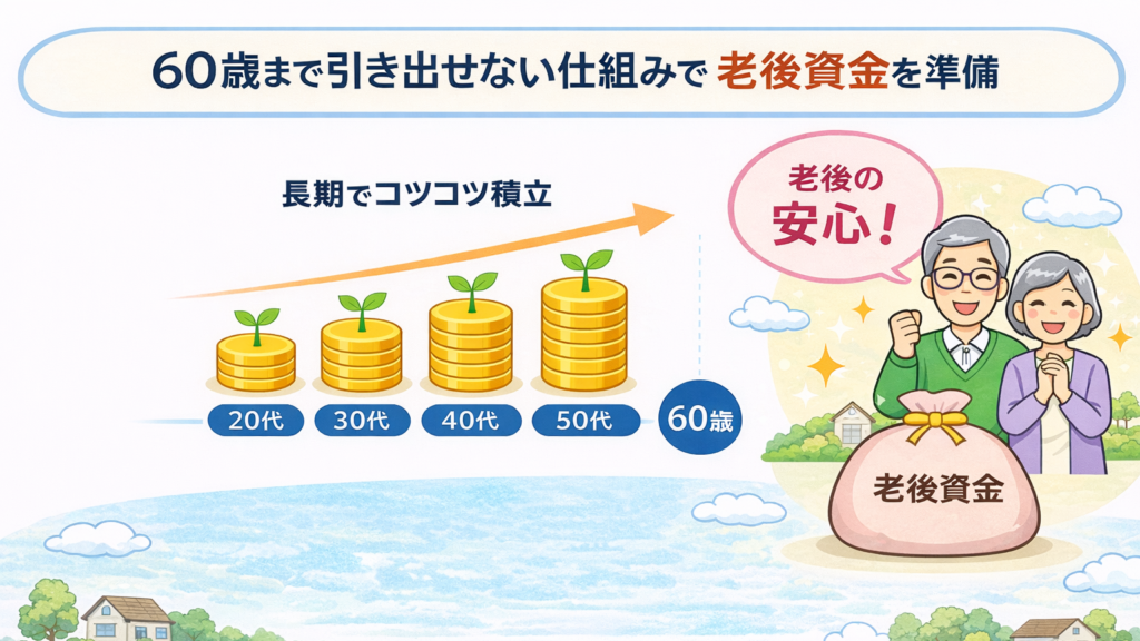 iDeCoは原則として60歳になるまで資産を引き出せない仕組みで、老後資金の準備を目的としています。途中で資金を使う心配が少なく、長期的に積立を続けやすい点が特徴の一つです。